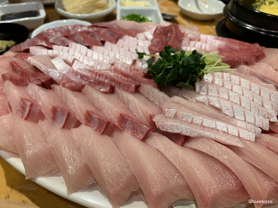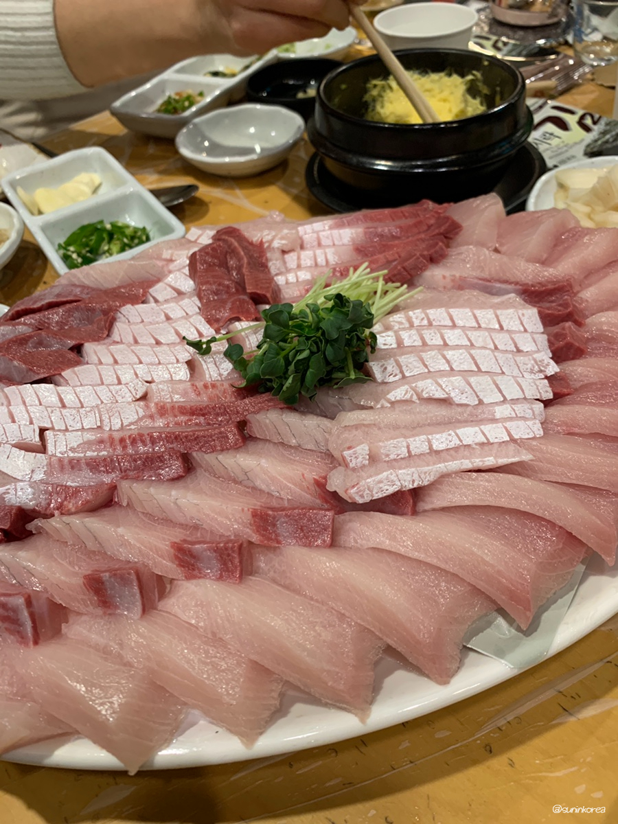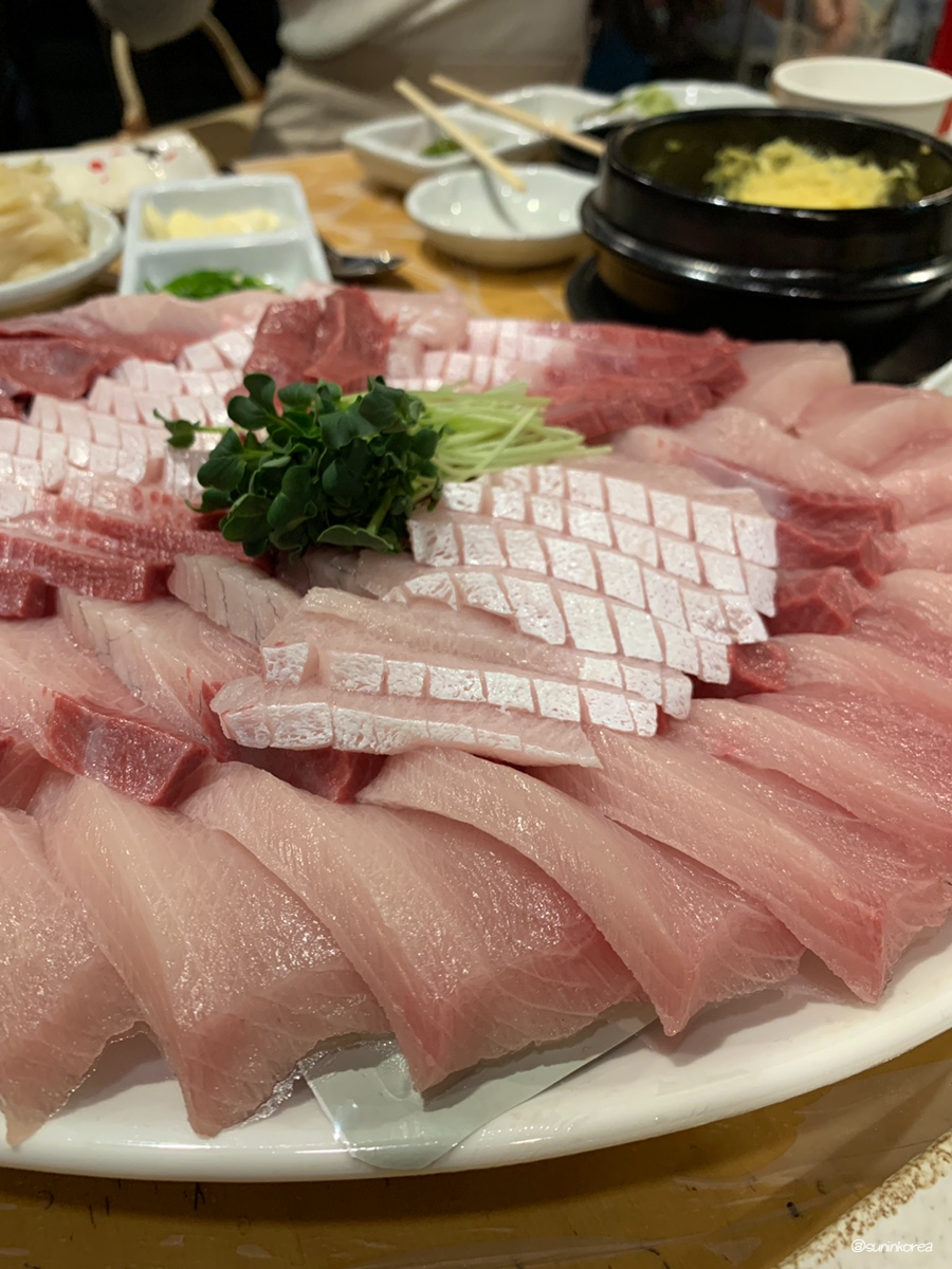 때깔 좋네... 부위도 다양하고 양도 많고 넘 괜찮다... 맘에 쏙 든다...!!! 대자라서 모든 부위가 다 있는 걸까? 내가 젤 좋아하는 배꼽살도 있고, 몇점 안나오는 사잇살, 어깨살, 등살 등등... 내가 방어로 태어났으면 진짜 알찼을텐데...ㅠㅠ 웨이팅이 있어서 좀 힘들었지만 그 기다림을 싹 씻겨 줄만큼 방어는 맛있었다. 또 먹고 싶넴 츄릅 ㅠㅠ 정말 좋은점이 초밥 밥도 같이 나와서 곡기를 채울 수 있다는 점 ㅠㅠ 초밥 위에 와사비 약간, 기름장 듬뿍 찍은 방어 한점에 무순 하나 올리고 김에 싸먹으면 여기가 바로 극락...... 초밥을 안싸먹을땐 밥 대신 묵은지 올리면 댐!!! 그리고 무순 필수!! 와 진짜 맛있엉 ㅠㅠ 힝힝 감자들이랑 같이 갔으면 최소 소주 +3병에 매운탕까지 조졌을텐데 술찔이들과 방문한 거라 술은 조금, 대방어는 싹 비우고 매운탕은 못먹고 나왔다. 아쉬워... 연산동 횟집은 진짜 여기로 정했다. 이번 겨울 안에 진짜로 숭어회 먹으러 갈래!!!!