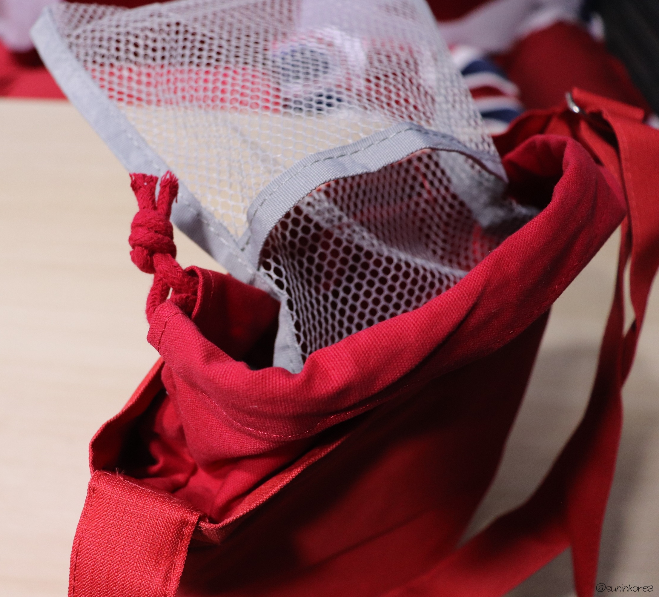 지퍼가 아니라 끈으로 조이는 형식이고 안에 벨크로나 지퍼가 없는 매쉬 주머니가 있어 따로 수납이 가능하다.