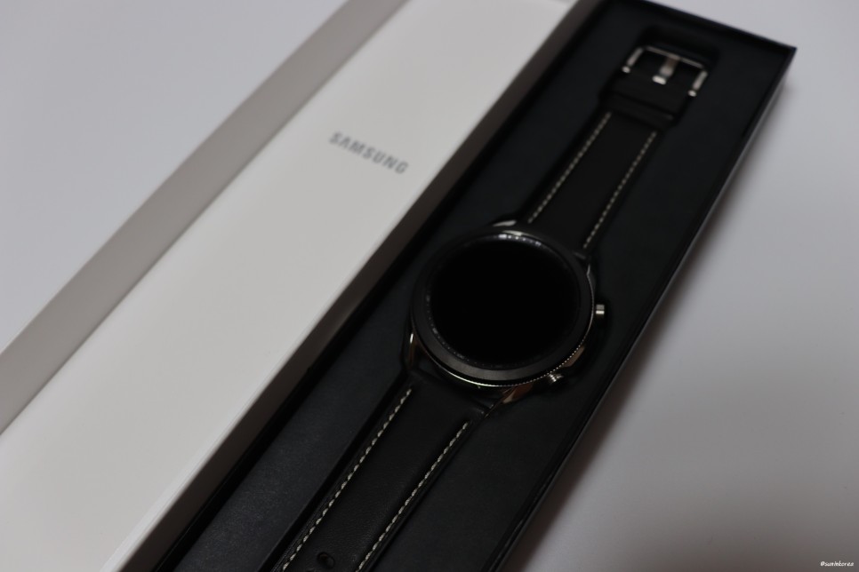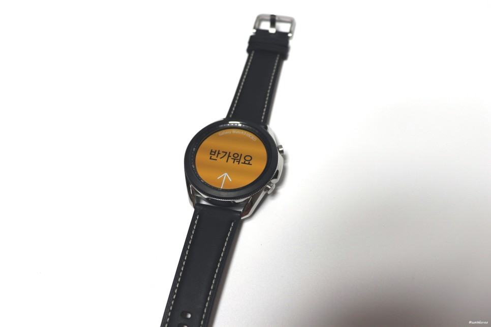 구매한 제품은 갤럭시워치3 실버 45mm인데, 베젤도 블랙이고 가죽끈도 블랙이라 실버 티가 많이 안나는 느낌. 훨씬 깔끔하고 예쁘다. 내껀 아니지만 맘에 쏙 든다...!!