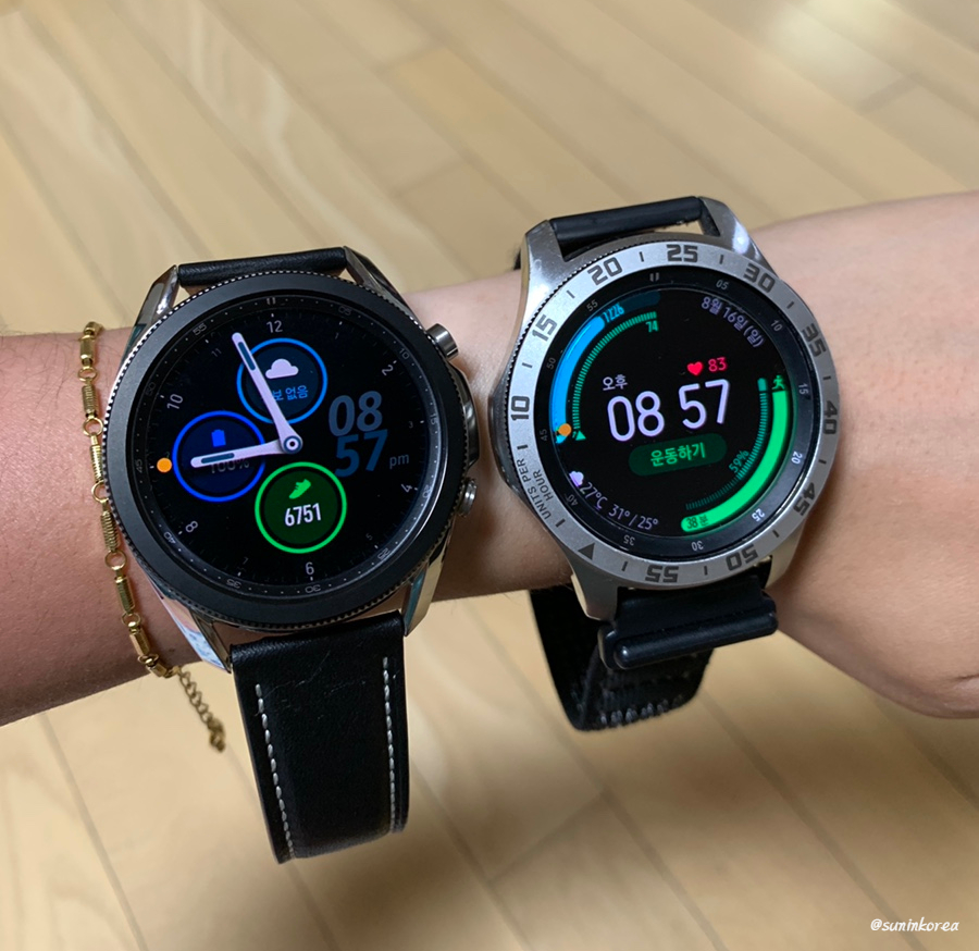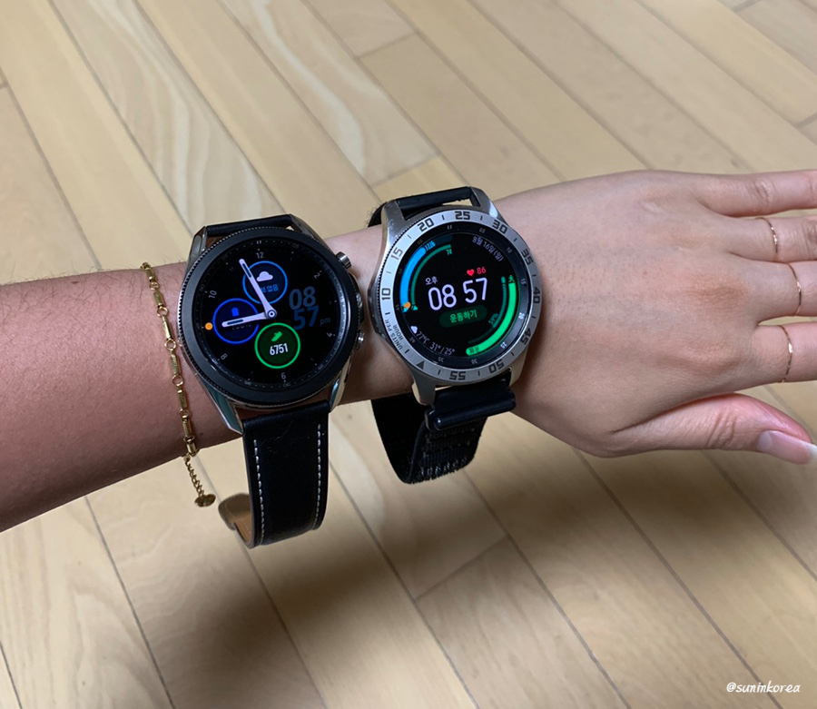 왼쪽이 갤럭시워치3, 오른쪽이 갤럭시워치2 이다. 갤럭시 워치2 에는 베젤 스티커도 붙이긴 했지만, 그걸 감안하더라도 갤럭시 워치3 가 베젤이 훨씬 얇고 화면이 꽉 차는 느낌이다. 그런데 무게는 갤럭시 워치 3 이 훨씬 가볍다. 이렇게 보니까 갤럭시 워치3 겁나 예쁘네...ㅠㅠㅠㅠ 갤럭시워치2 든, 워치3 이든 45mm는 여자 손목에는 확실히 크다!!