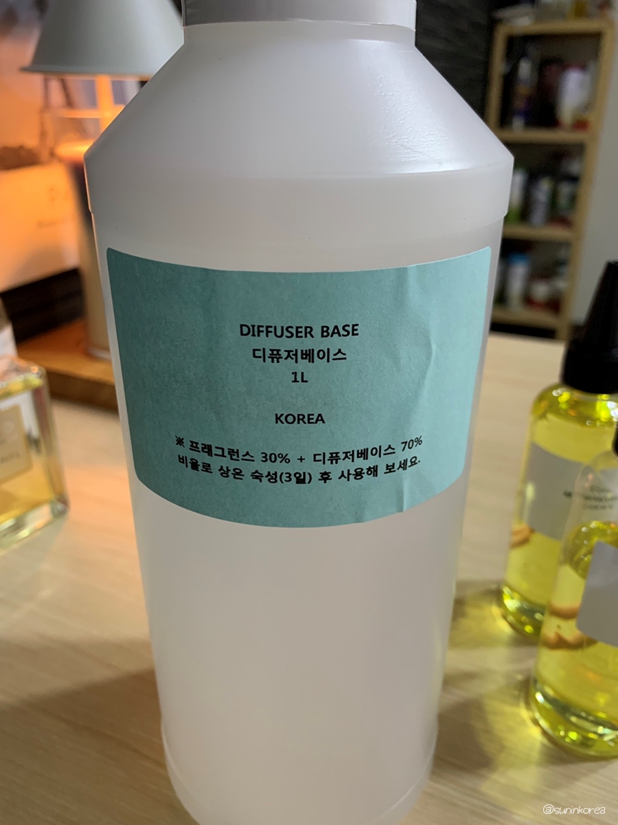 넘나 쉽다!!! 적혀 있는 대로 3일쯤 숙성했다. 참고로 원액 오일을 저만큼 부으면 나중에 향이 퍼질 때 너무 진해서 난감하다. 저보단 부디 적게 부으세여... 어제 디퓨저 베이스를 추가했답니다...