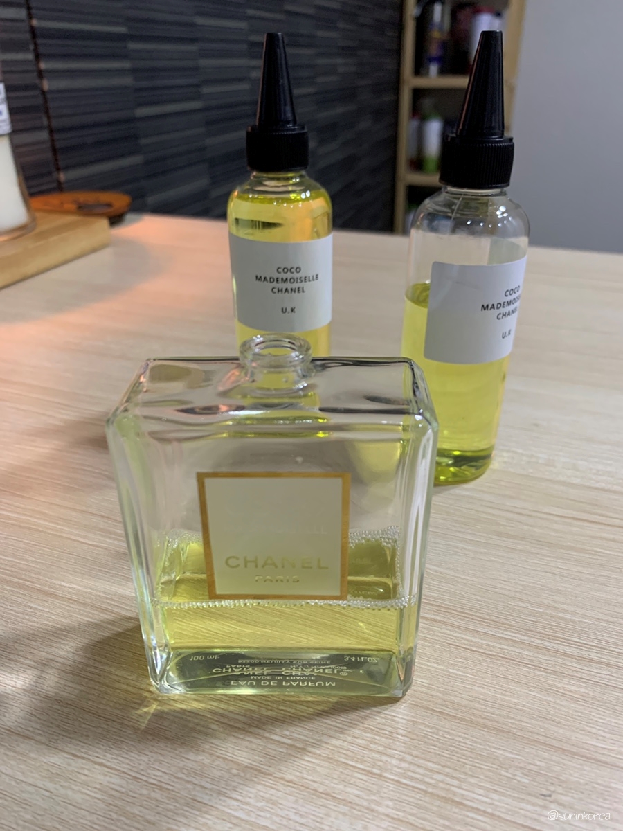 이때까지 단 한번도 향수를 재구매 한 적이 없는데 결국엔 다시 돌아갔다. 취향은 올곧구나를 느끼며 주말 출근에 열이 받아 힐링하고자 향기 뿜뿜 하는 것들을 사기 시작했다. 차량용 방향제도 사고, 미니 캔들도 사고, 디퓨저도 새로 사려고 했는데 갑자기 향수 생각이 나면서 같은 향기로 하면 좋겠다라는 생각이 번뜩 들어 인터넷 검색을 해봤다. 그런데 따로 샤넬에서는 디퓨저가 나오지 않는 것 같아 만들기로 결심!! 예전에 썼던 샤넬 코코 마드모아젤 향수 공병이 있어서 거기다 만들기로 결정했다.