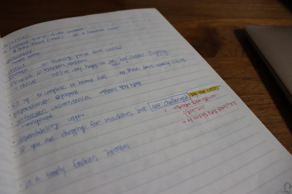- P7: 해석을 내맘대로 날림으로 하는 경향이 있었음. 아는 단어만 보고 대충 유추한달까? 그리고 줄 그으면서 읽긴 하지만 머릿속으로 해석을 하는게 아니라 그냥 알파벳을 읽는(?) 경향이 있어서 이번에 그 버릇을 고쳐보기로 함. 정성들여 조금 천천히 그치만 꼼꼼히 읽었고, 해석이 안되는 부분은 형광펜으로 칠한 후 머릿속으로 해석하는게 아니라 한글로 해석한 문장을 통째로 직접 쓰기 연습을 함. 시간이 많이 걸려서 이 방법은 학원 수업 때 공부한 지문만 했음