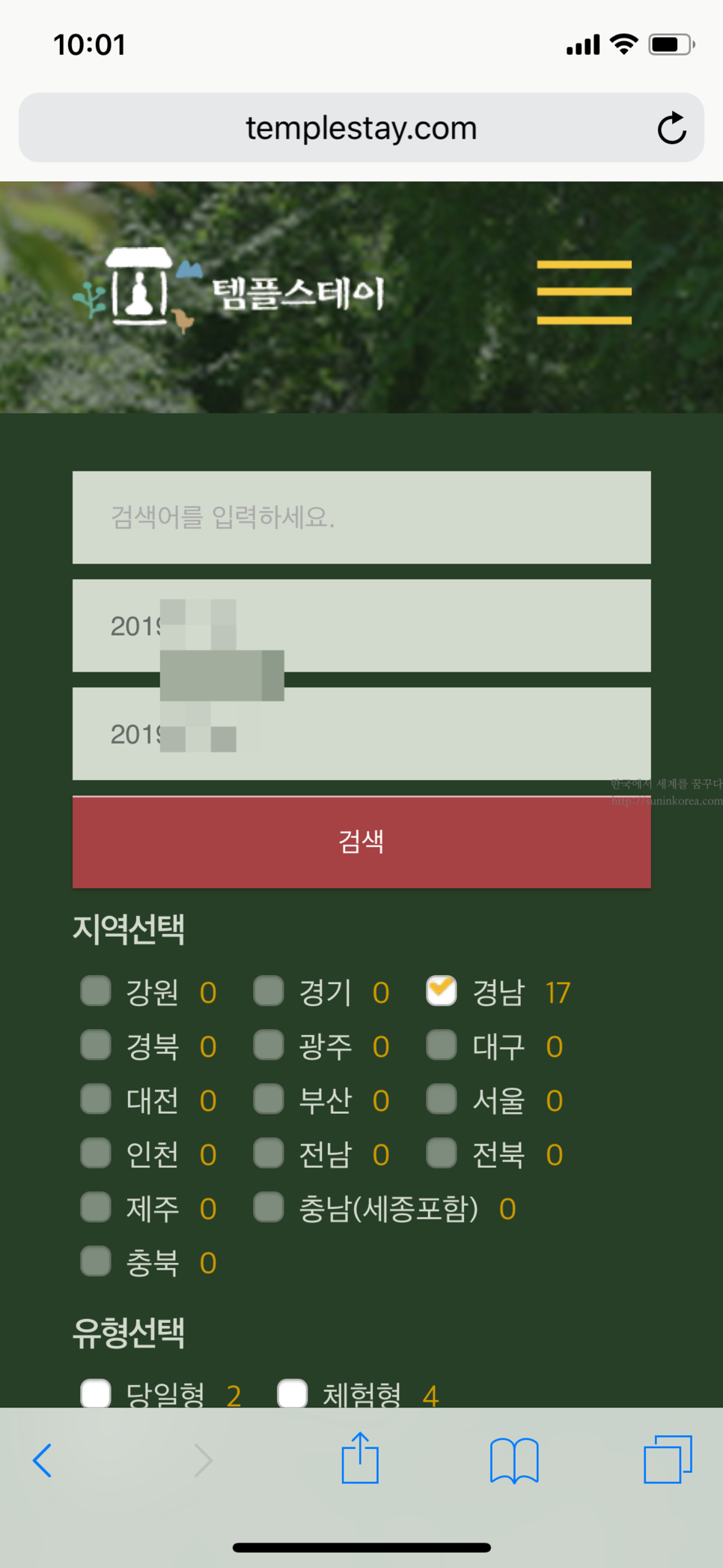 2) 희망 날짜와 지역을 입력하면 가능한 절의 리스트들이 주루룩 뜬다. 가격은 1박에 5만원. 주말 비용은 잘 모르겠지만 주중 가격은 경남권일 경우 거의 비슷했다.