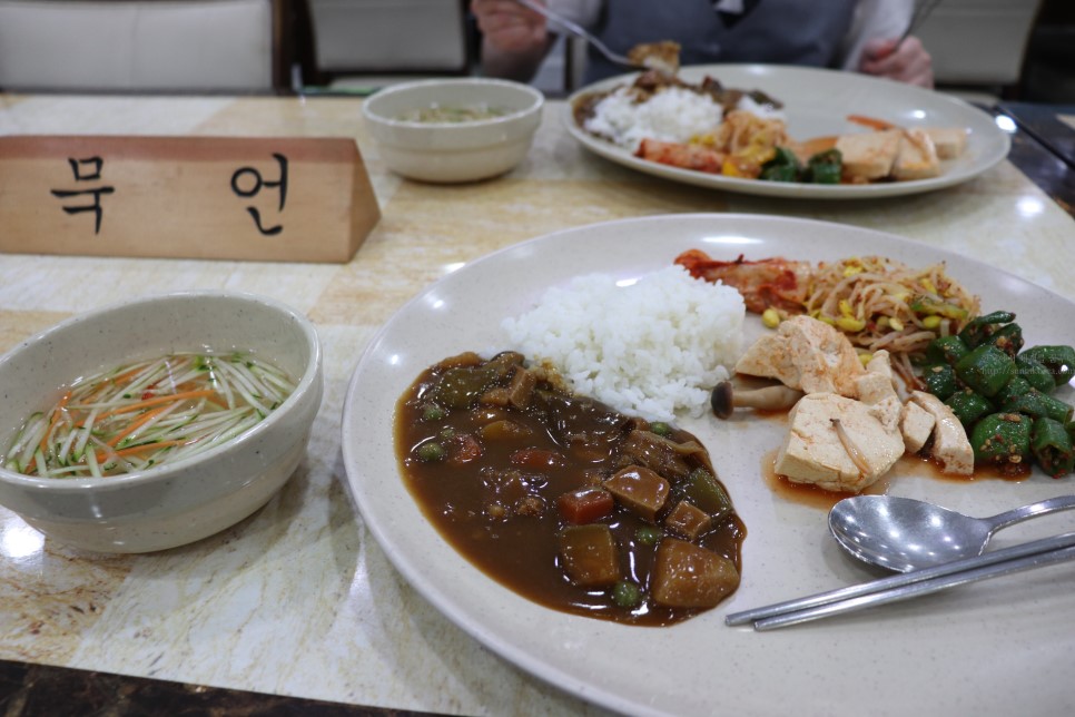 오후 6시 10분. 시간을 칼같이 지켜 식당에 입장을 했다. 다행히 요즘은 발우공양(단무지로 그릇을 설거지 한 후 물까지 마시는 것...ㅠㅠ)을 하지 않는다고 한다. 했으면 밥 못먹을 뻔... 거기다 공양도 급식이다 ㅋㅋㅋ 뷔페 접시 같은 대접에 밥과 카레, 반찬들을 담고 스님이 직접 떠 주신 오이냉국을 받아 공양을 했다. 공양의 기본은 '묵언'이다. 지금까지 얼마나 많은 말을 하며 밥을 먹었던가. '배고픔'보다는 '맛'을 먼저 찾는 요즘, 음식을 준비한 수고는 말할 것도 없고 생존과 직결된 배고픔에도 집중하지 않고 오로지 맛이 있니 없니, 이 소스는 내입에 맞니 안맞니부터 따지고 평가하며 밥과 관계 없는 잡담으로 밥상을 채운다. 떠들 일이 없으니 밥에만 집중했다. 생각보다 어색하지도 않았고 편안했다. 단 한번도 음식점에서 혼밥 해 본 적이 없는데 이제 할 수도 있을 듯...ㅎㅎ