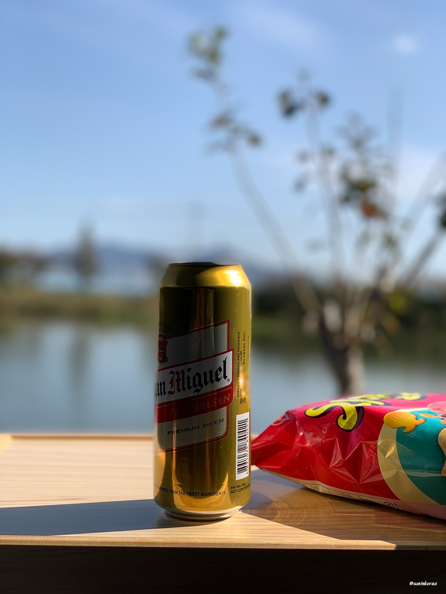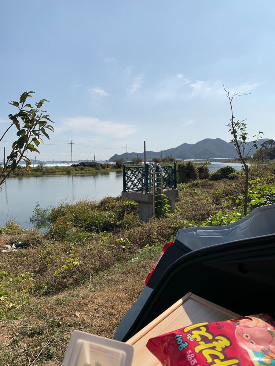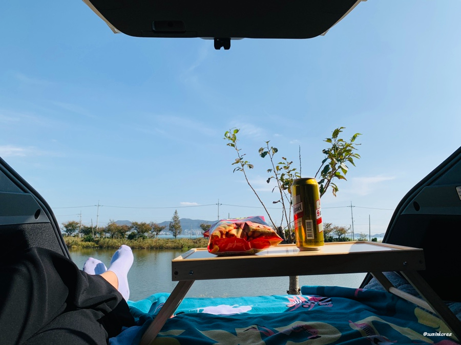 길이 어떻게 되어 있는지 몰라(길치다) 양방향 2차선 도로에서 차가 오지 않을 때 유턴을 해, 카페 주차장 쪽으로 들어가 차가 즐비해 있는 곳으로 향했다. 초행길이었기에 화장실 위치를 파악할 틈도 없이 빈 자리에 얼른 주차를 했다. 뒷좌석을 눕히고 세팅 후 토퍼를 깔고, 배게도 예쁘게 두고, 트렁크에 있는 탁자랑 릴렉스 체어도 꺼내고... 양말도 벗어 던지고 20일째 열심히 출근했던 나 자신을 기특하게 생각하며 산미구엘을 뜯었다. 후... 스트레스 꺼져!!! 그래 이게 행복이지, 행복이 별거 있나.