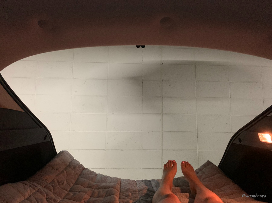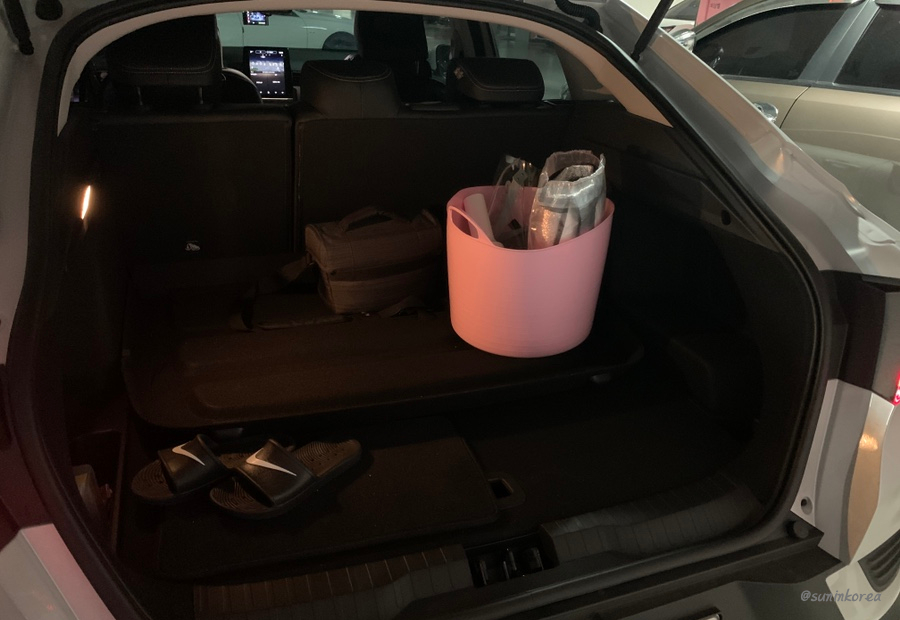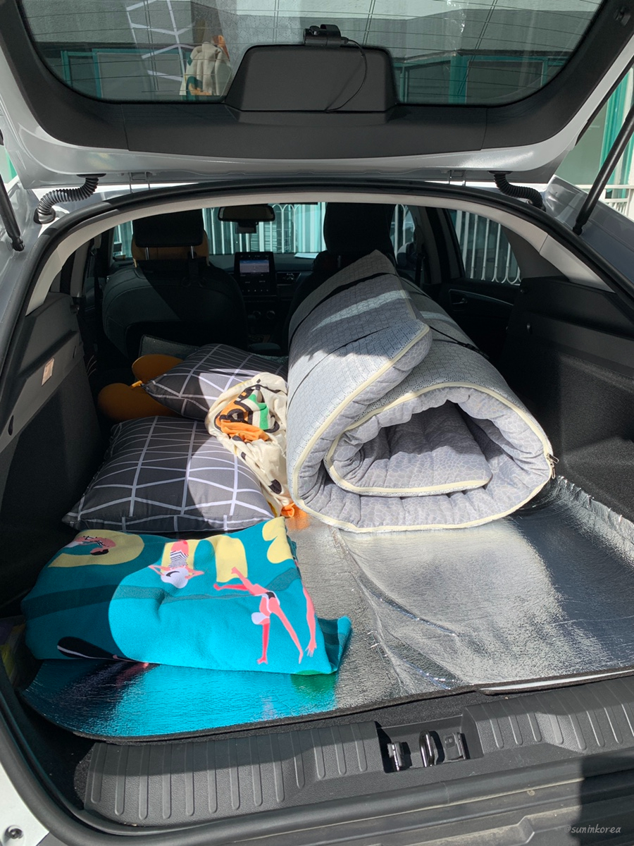 수영용품으로 범벅된 내 트렁크. 언제든지 물에 뛰어 들 수 있게 저 분홍 플라스틱 바구니 안에는 간단한 샤워용품과 비키니가 준비되어 있고, 무선 청소기와 태닝을 위한 돗자리도 상시 대기 중! 뿔소라를 넣을 수 있는 망까지 구비되어 있다. 슬리퍼도 차에 두면 참 요긴하게 쓰인다. 2열을 숙이고, 카메라는 발 밑에, 핑크 바구니 안에 있는 것들은 트렁크 아래 공간으로 대피 시켰다.