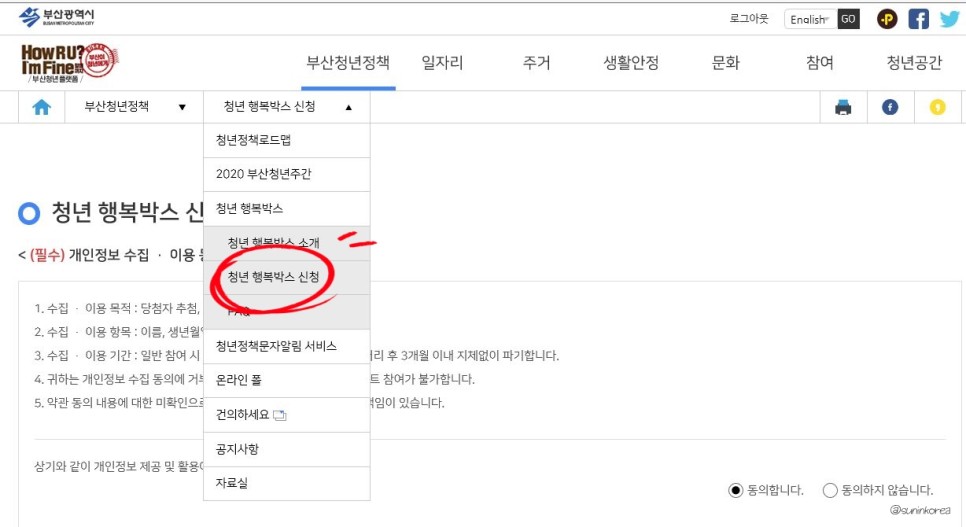 2. 아래로 드롭바를 내려서, <청년 행복박스 신청> 을 클릭한다.