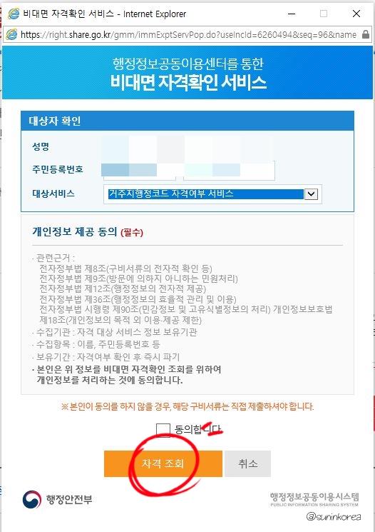 4. 회원가입 후 로그인을 한 상태이기 때문에 성명과 주민번호 앞자리는 입력되어 있다. 뒷번호와 거주지행정고드 자격여부 서비스를 선택하고 동의합니다 체크 후 자격 조회를 하면 확인이 됐다는 창이 뜨면서 기존의 창이 닫힌다.