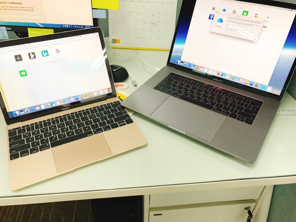 공식홈페이지에 뉴맥북은 0.92kg, 맥북프로는 1.83kg이라고 나와 있는데 체감상 3kg쯤은 되는듯...^^ 어깨가 빠질뻔 했다. 그리고 맥북 최고 존엄이었던 트랙패드도 뉴맥북과는 비교가 되지 않을 정도로 커서 작업하기에 훨씬 편하다. 뉴맥북과 비교했을 때 단점은 당연히 크고 무겁다는 점과 키보드 터치감이 뉴맥북보다는 맥북프로가 떨어진다. 뉴맥북은 뭔가 착 감기는 느낌이라면 맥북프로는 마구마구 날리는 느낌이다. 장점은 크다! 커서 장시간 작업할 때(라고 해봤자 키노트밖에 없지만...) 훨씬 피로감이 덜하고 뉴맥북에 비해 USB포트가 많다. 전원포트까지 합해서 네개는 되는듯. 뉴맥북은 전원 포트까지 합해서 1개...^^ 지금 생각해보니 미쳤구나 뉴맥북^_______^