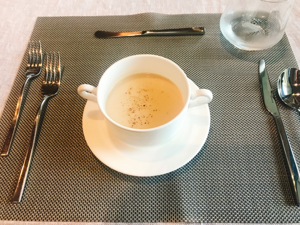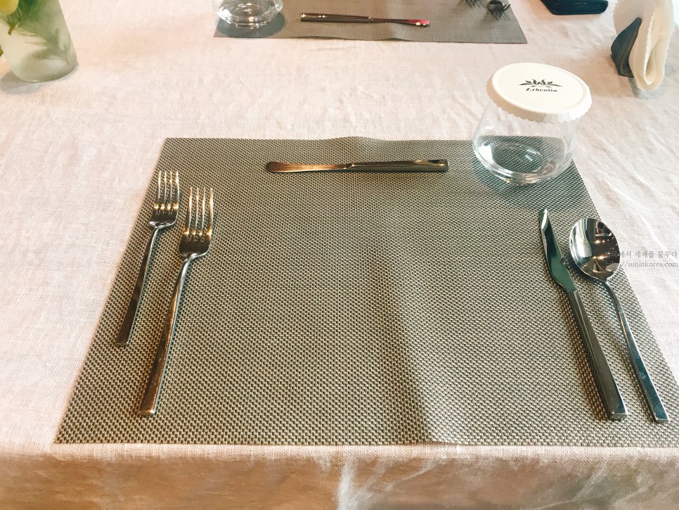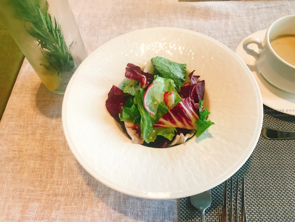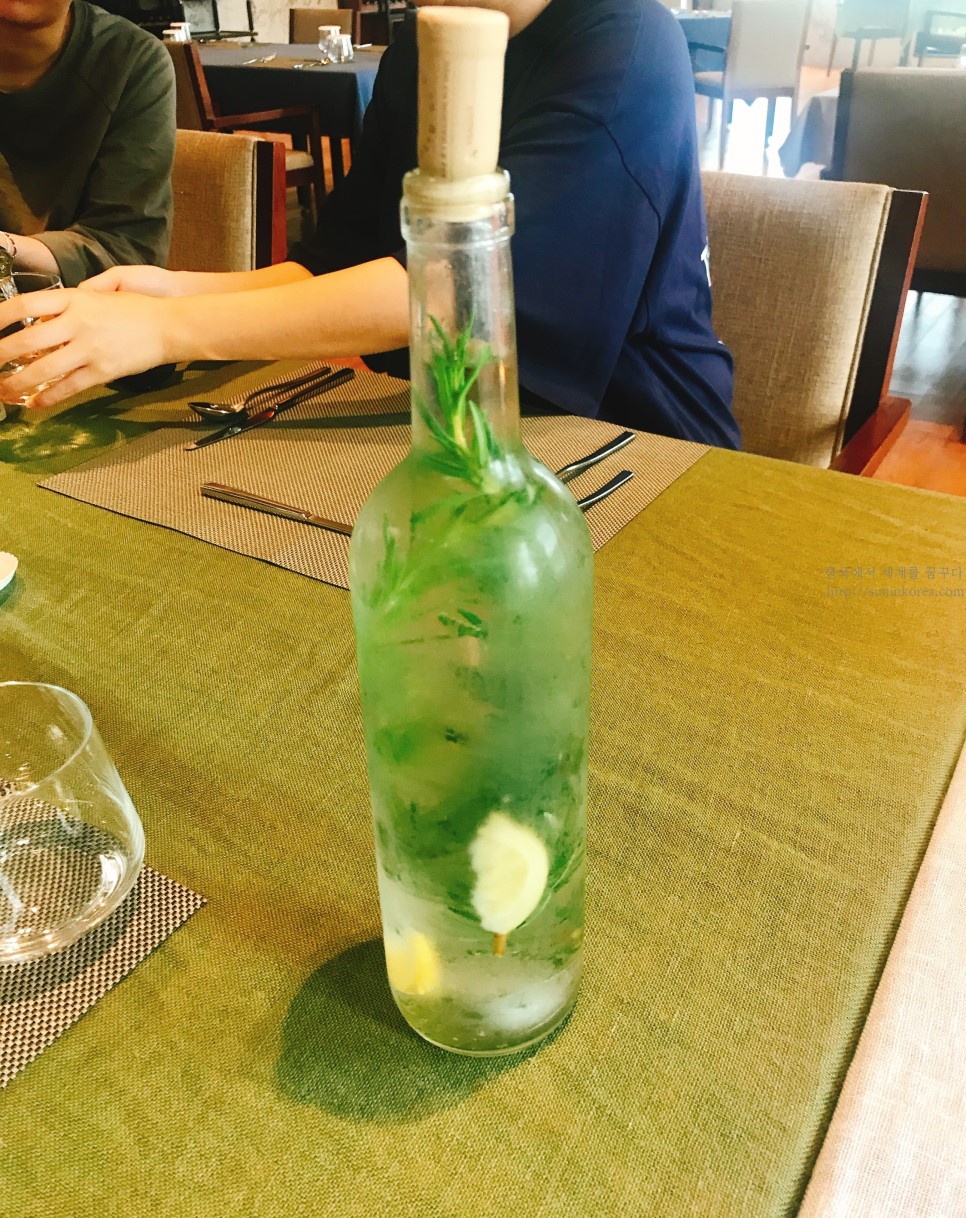 먼저 요렇게 예쁜 물병에 물을 담아 주셨다. 레몬이 들어간 건 알았지만 저 푸른 잎사귀가 뭘까 궁금했었는데, 물을 마셔보니 향긋한 로즈마리 향이 났다.