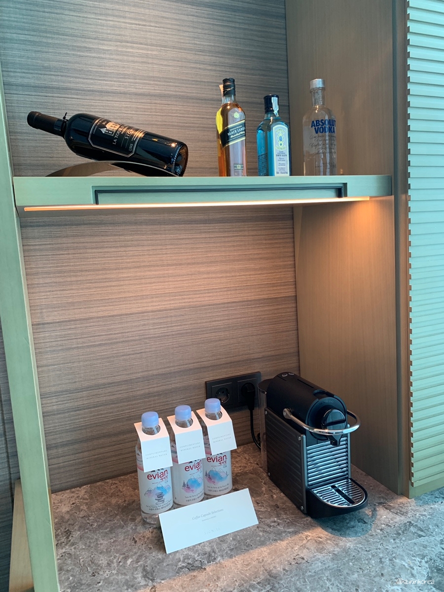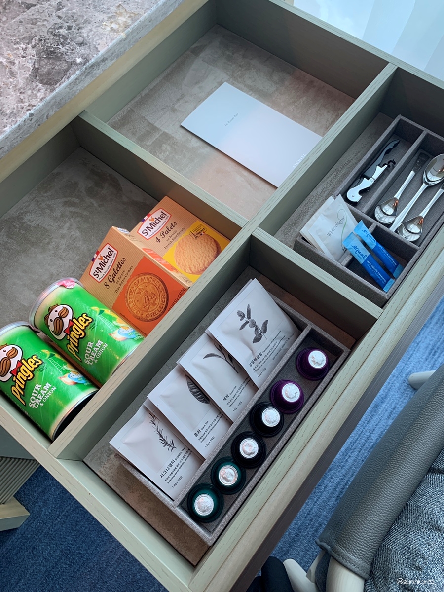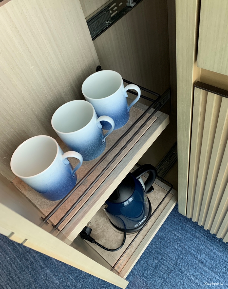 미니바 아래칸을 열어보면 그냥 들고 가도 되는 티백들과 무료인 커피캡슐, 사용 가능한 커피포트도 있다.