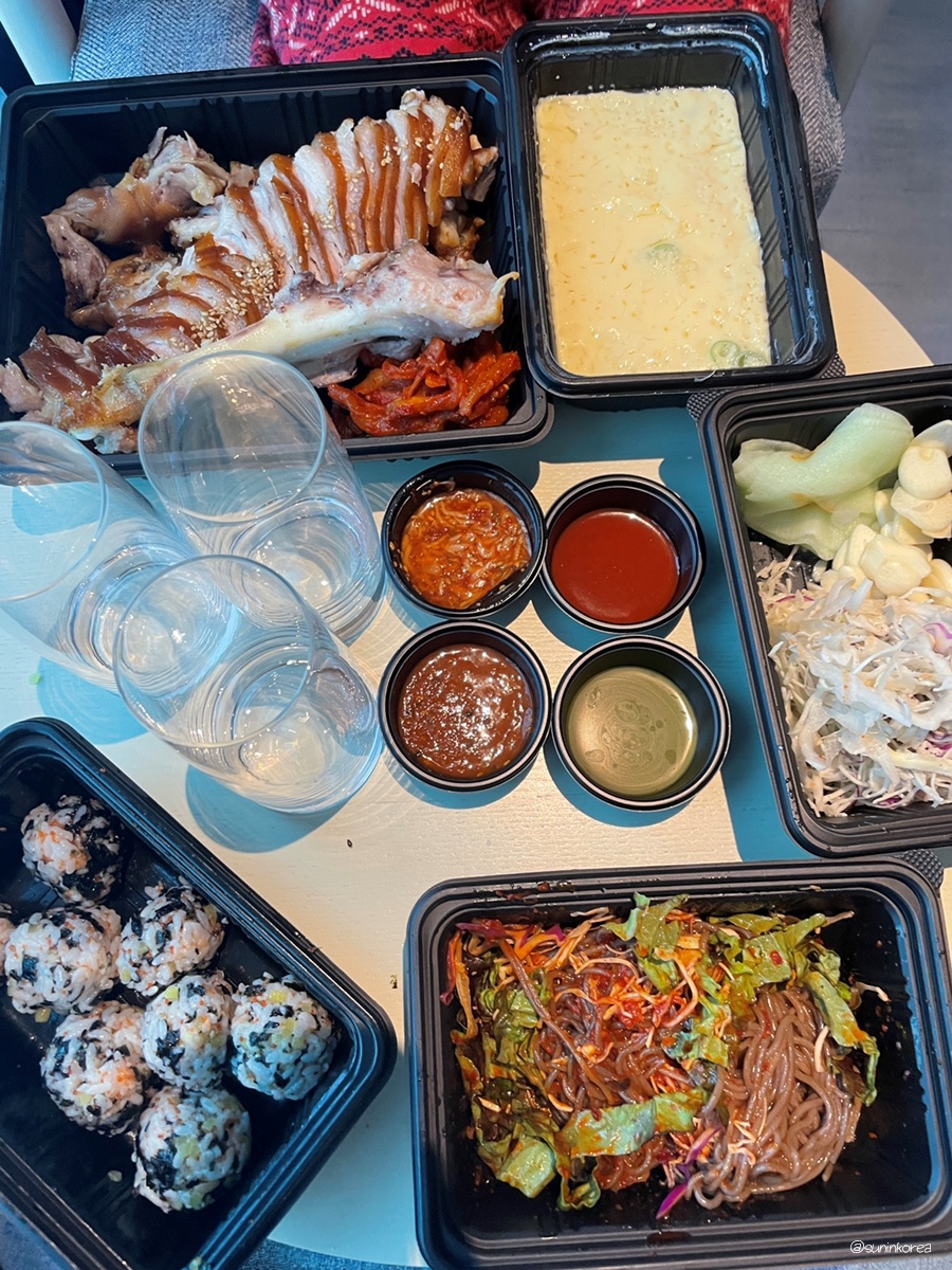 그래서 족발을 시켜 먹었었는데 몇개는 각자 무릎 위에 두고 먹었음 ㅠ.ㅠ... 끙