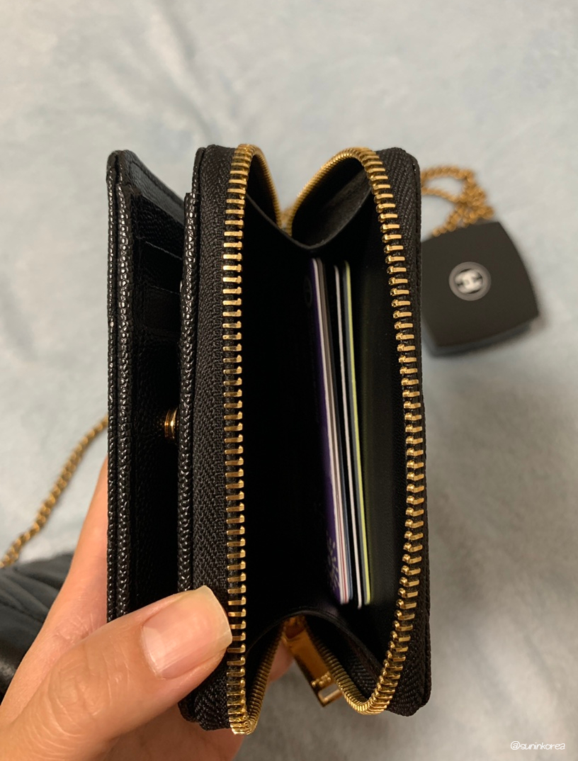 그런데 이것도... 끙 생각보다 이건 너무 크다!! 크고 두껍다!! 앞쪽은 쫙 열어서 지폐칸이랑 카드칸(양쪽으로 3개씩 총6개)이 있는 반지갑이고, 등에는 코인 포켓이 있어서 두 껍 다. 카드 슬롯 말고 그냥 명함 지갑을 샀어야 했다. 현금 거의 안들고 다니고, 카드도 굳이 칸칸이 나눠 다닐 필요가 없는데... 카드칸 넣기가 불편해서 그냥 동전 지갑에 자주 쓰는 카드들 다 때려 붓고 다님 ㅋㅋㅋㅋ 현금도 들고 다니고, 상품권이나 쿠폰, 동전도 들고 다니지만 반지갑을 쓰시는 분이라면 강력추천! 구성이 참 좋다. 그리고 블랙에 골드 조합이라 밋밋하지도 않고, 그렇다고 과하지도 않고, 심플한 것 같으면서 화려하다. 데일리로 딱 좋은 듯. 호불호도 크게 갈릴 것 같지도 않아서 여자친구 서프라이즈 선물로도 최고 좋을 것 같다.