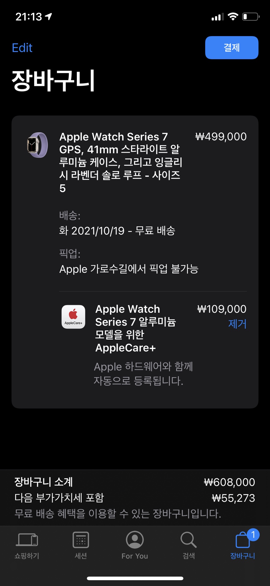 Apple store 어플로 접속도 해보고, 홈페이지에서 접속도 해보고...ㅎ 색깔을 마지막까지 고민했다. 애플은 스그가 진리라고 생각하는 휴먼이라 검정 계열인 미드나이트를 사려고 했는데 엄마가 진한 색은 찍히면 티가 많이 난다고 잘 생각하라는 한마디에 바로 마음을 바꿨넴. 지금 로즈골드 애플워치도 잔기스 파티라...ㅋㅋㅋㅋㅋㅋㅋ 연한 색이라서 티가 많이 안났구나... 오케 접수! 스타라이트로 정하고 한번도 써보지 않았던 솔로루프, 색깔은 라벤더로 결정했다. 왜? 난 아 미 니 까! ♥(보라하트) 손목 사이즈가 고민 되었긴 하지만 조금 편안하게 끼고 싶어서 사이즈5로 선택! 499,000원이라고 생각했는데 잠만... 애플케어도 있네...? 힝... 또 오래 쓸꺼니께 2년 되기 직전에 돈 내고 리퍼 받고 3년 더 써야지!! 그래서 애플케어도 추가!!! 원래 10월 19일 배송으로 떴는데 나이키 에디션을 뒤늦게 알아 고민하다가 끈이 너어어어어무 맘에 안들어서 결국 원래껄로 다시 주문하니 11월 배송으로 늦어졌당 ㅠ.ㅠ 아쉬웡