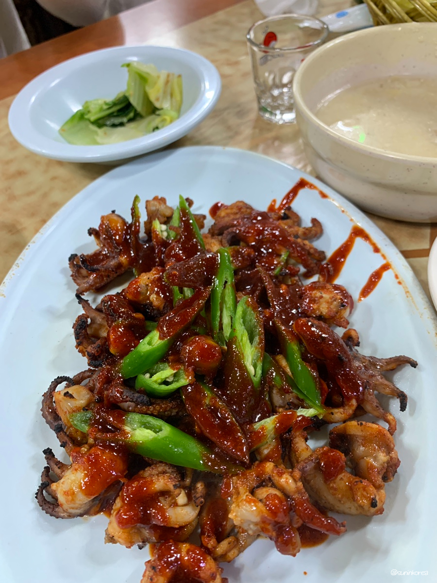 실외에 있는 연탄 직화에서 바로 구워주시는 거라 너무너무 맛있었다. 쭈꾸미도 부드럽고 소스도 증맬 맛있고... 거기다 땡초 올려먹으면 환상임 ㅠ.ㅠ 꺙 마싯성!!!!! 요거 한입에 또 소주 한잔...♥