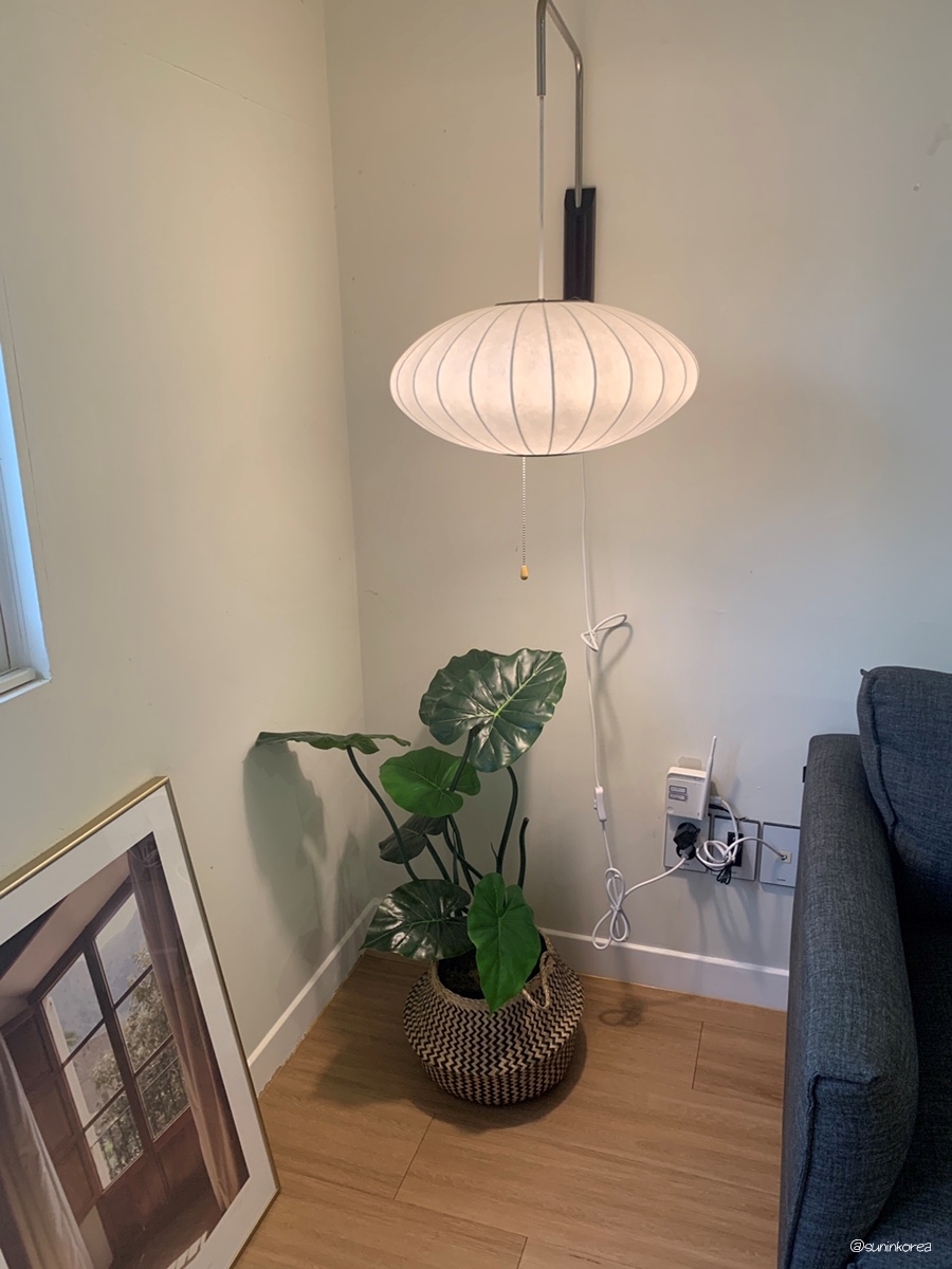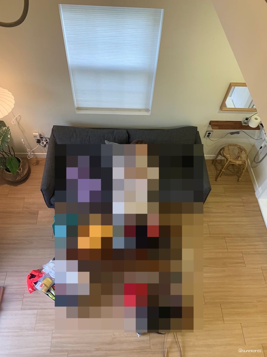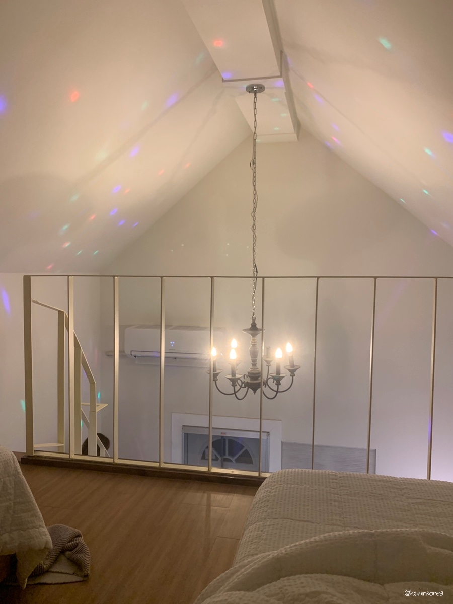 복층 특성상 천장이 낮아 수그리고 이동해야 하는 불편함이 있다. 침구류에서 진짜 좋은 냄새가 나서 호텔 같은 쾌적함은 아니지만 깔끔한 느낌이 들었다. 발끝엔 샹들리에도 보인다.